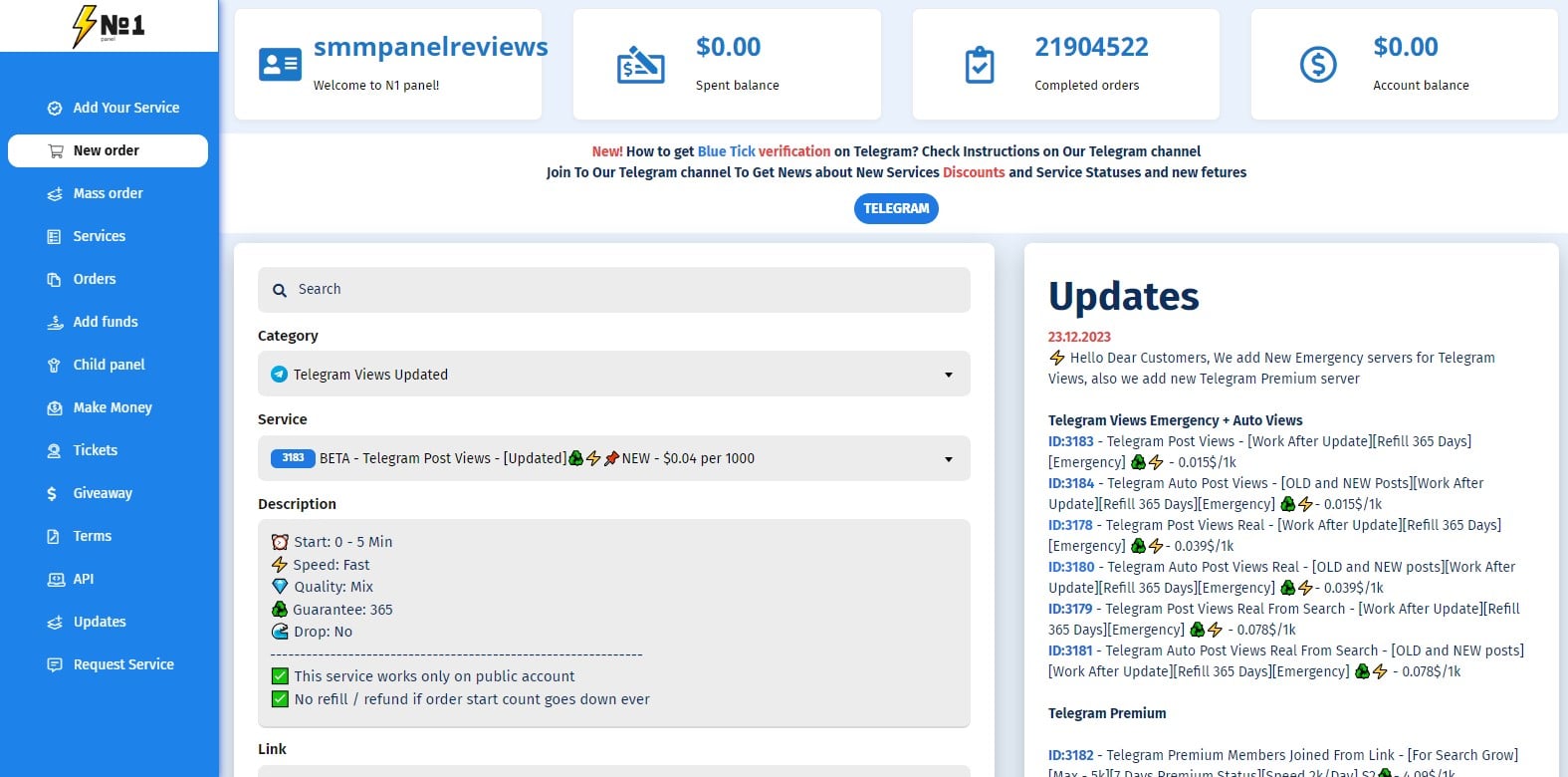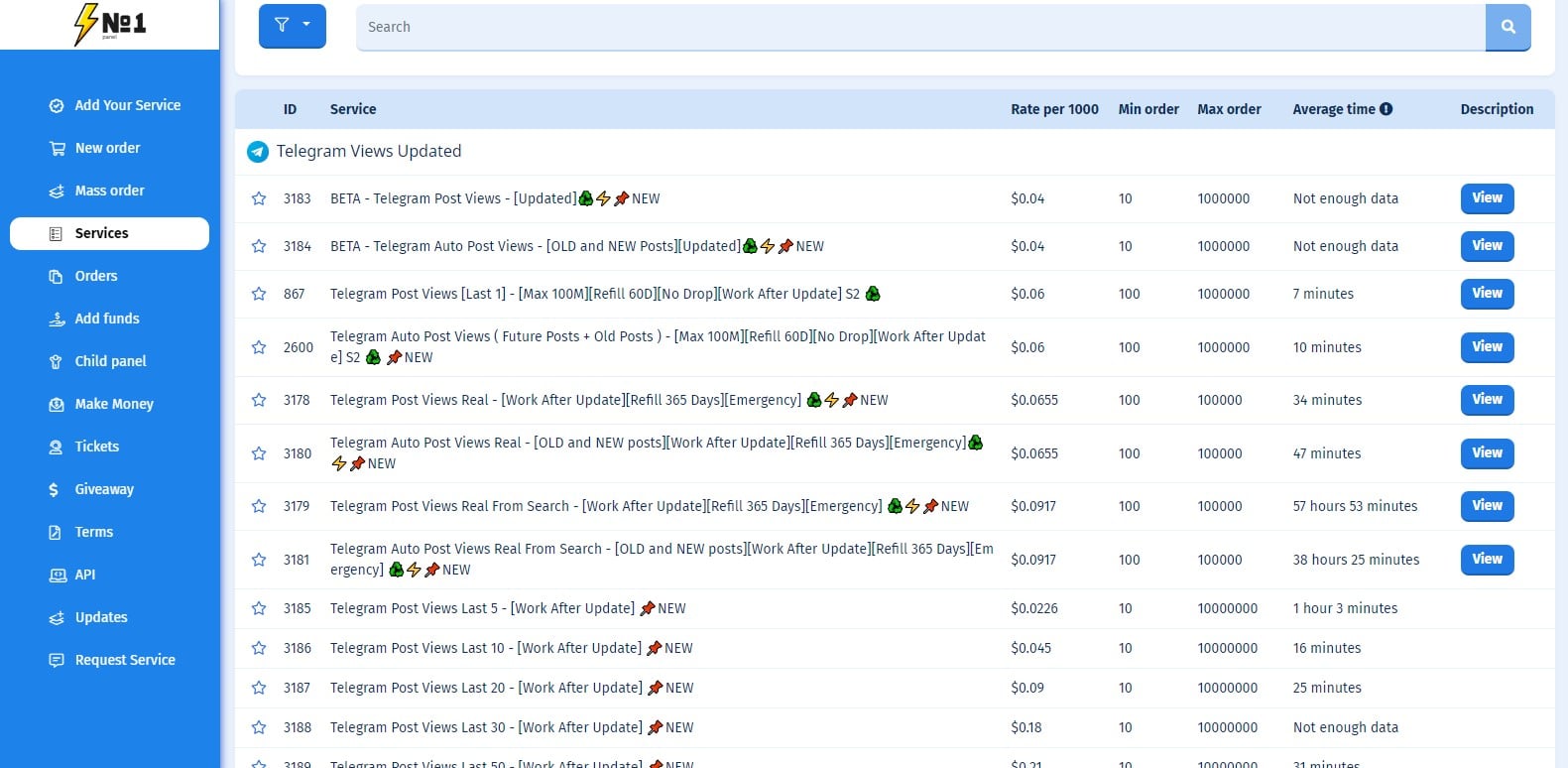 Latest services added on No. 1 Panel