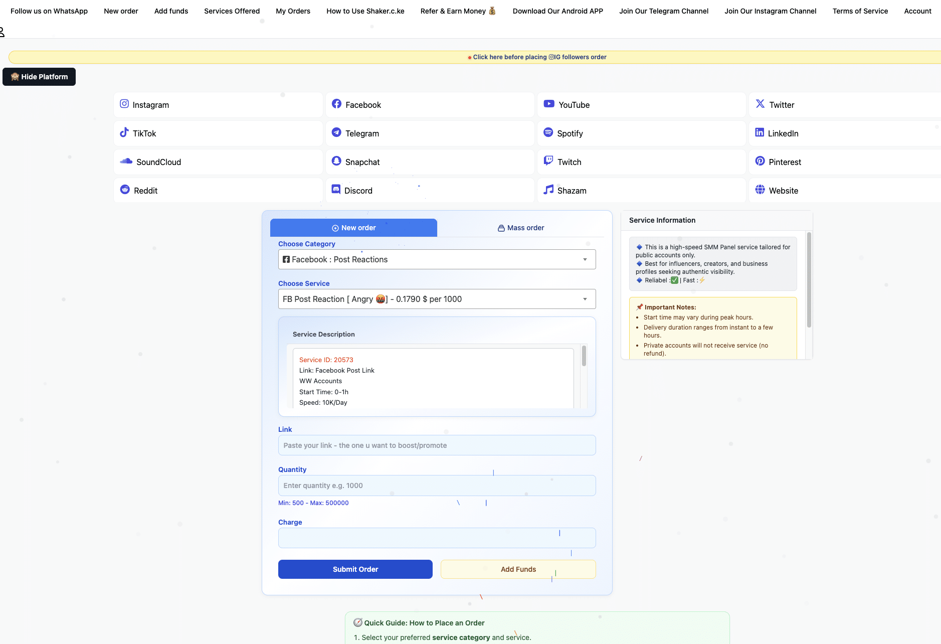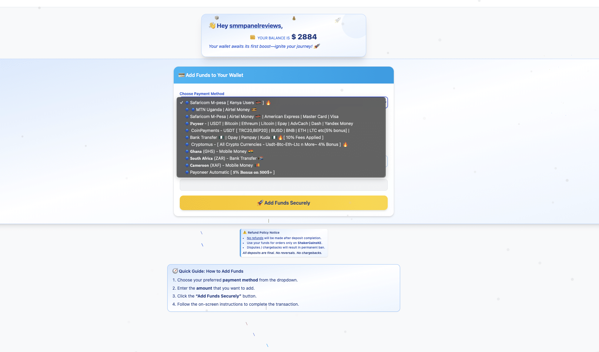 Shaker is Africa’s #1 SMM panel built for fast, affordable, non-drop growth across Instagram, Facebook, YouTube, TikTok, Telegram, Threads, X, and more. Getting started is simple: register, add funds (M-Pesa, cards, PayPal, crypto, and local gateways), place an order, then track results in real time. Creators, agencies, and resellers get high-retention followers, likes, views, comments, and channel members, plus refill-eligible options and 24/7 WhatsApp support.