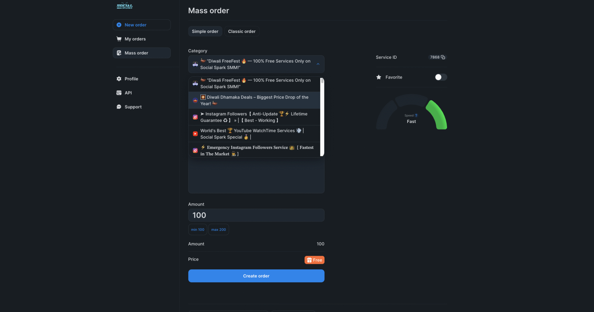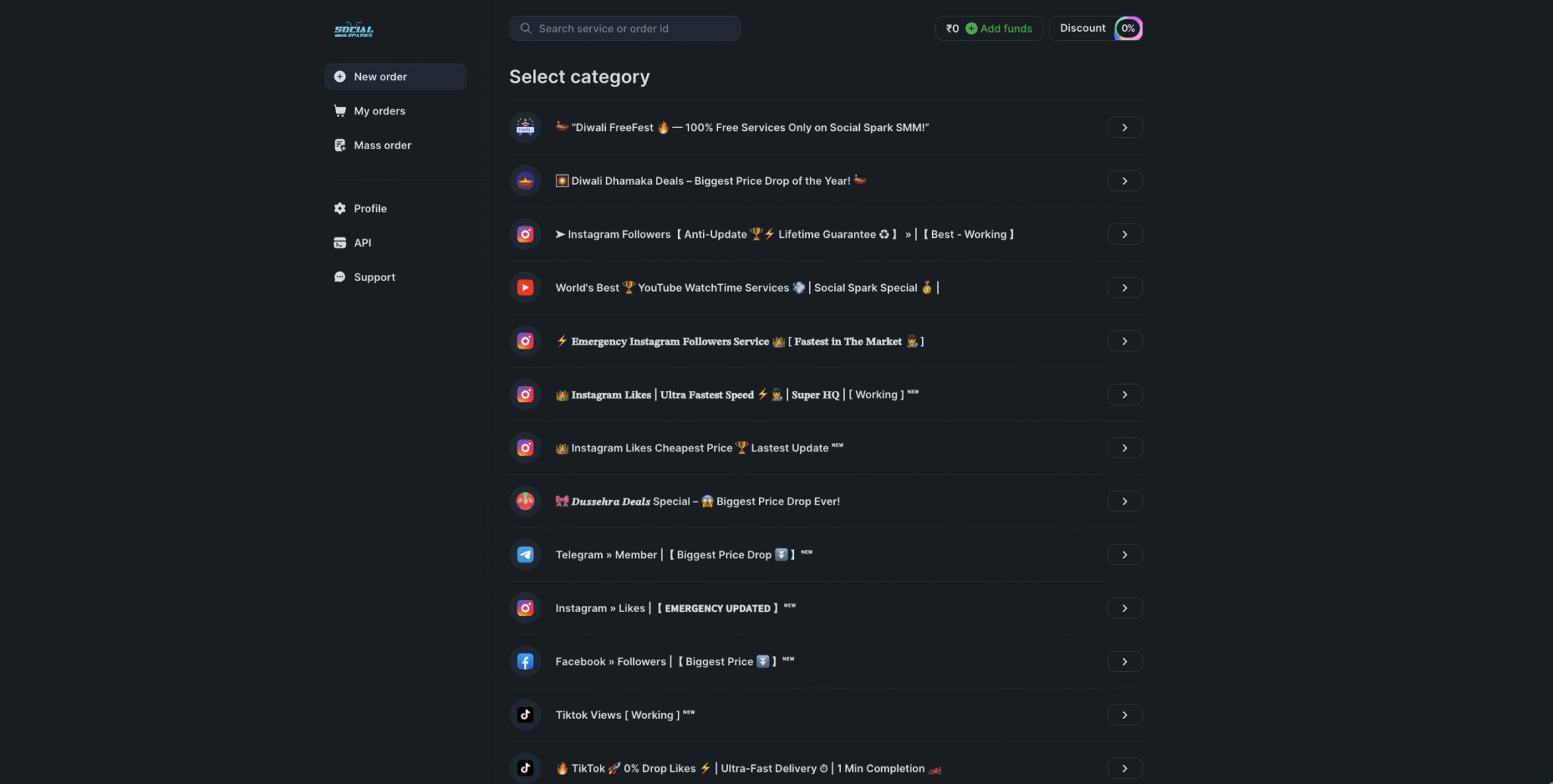 For creators, agencies, and resellers who want a quick setup and precise tracking, SocialSparkSMM is an affordable SMM Panel. There is an easy-to-use menu with New order, My orders, Services, and Help on the panel, as well as API v2 support. Like Instagram followers, YouTube views, Twitter followers, Facebook friends/subscribers, VK likes, and more, you can set up campaign types and then use live counters to see how things are going (e.g., 2,500 of 5,000 delivered).